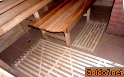 Для оттока воды из мойки на пол кладутся деревянные трапы, сбитые из реек или резиновые коврики. По окончании каждой помывки эти покрытия следует отлично просушивать. Неприемлемо применение для покрытия пола моечной каких-то синтетических материалов, какие при нагревании, почти всегда, выделяют ядовитые для человека вещества.