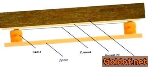 - Поверх укладывают теплоизоляционный материал, например, базальтовую вату.