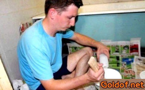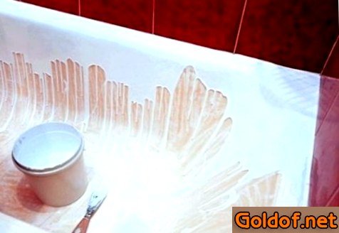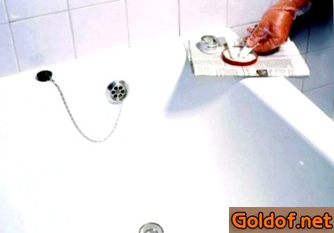 - Взятым составом заливают место между ванной и кафелем, по окончании чего перебегают к нанесению акрила непосредственно на поверхность ванны, которое реализовывают сверху вниз, переливая взятую смесь узкой струей так, чтобы она плавненько стекала в нижнюю часть ванной. Избытки стакрила будут неторопливо стекать в сливное отверстие ванны, но мы заранее подставили под него пластиковую тару;