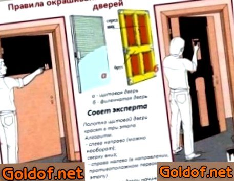 - В случае если перед покраской дверь не снимали, и она находится в вертикальном положении, то работы начинают сверху, неторопливо спускаясь вниз. Это разрешит избежать наплыва капель на ранее окрашенную поверхность. При горизонтальном размещении полотна красить можно как угодно, но придерживаясь данного направления, без беспорядочных мазков и мест стыковки.