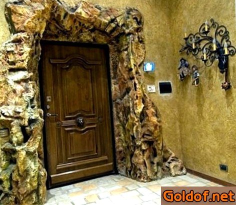 - Отделка входной двери декоративным камнем. Для элегантного дизайна достаточно нередко используют ненатуральный камень. В особенности безпроигрышно смотрится вариант, в то время, когда он делается продолжением стеновой отделки из этого же материала. Избранные элементы обязаны иметь толщину менее четыре мм, в неприятном случае вес, создаваемый на полотно, окажется через чур огромным.