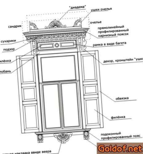 Высшую часть оконного наличника декорирует «кокошник», где с давних пор было принято изображать Солнце. Высшую часть по мере надобности можно увеличивать, соединяя составные детали шипами. Нижнюю называют «полотенчики», она должна обладать водоотбойным скосом для стека воды. Нижняя планка обязана иметь толщину на 10 мм большей верхней планки. Набросок нижней части стилистически должен совпадать с изображением на «кокошнике».