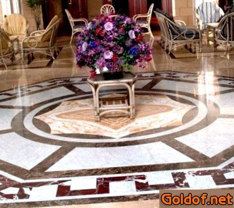 В современной городской квартире не настолько не мало места, как во дворцах, где мраморные полы были неотклонимым атрибутом отделки. Плитка из особо крепкого и долговременного камня остается одним из более дорогих материалов, но пара плиток на небольшой метраж городской квартиры – это довольно экономично. Трудно переоценить и ее наружные достоинства, в особенности в виде мозаичных орнаментов и узоров, как, например, мраморная плитка на пол – фото: