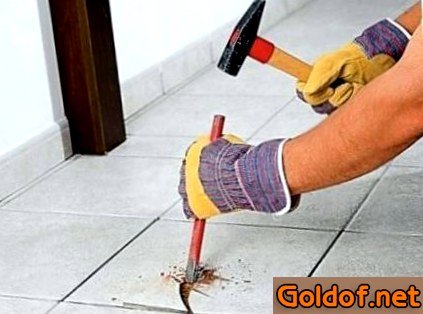 - Позже перфоратором просверливают отверстие по центру. И от него начинают заботливо удалять плитку по кусочкам с помощью стамески и молотка. Основное, чтобы инструменты не сорвались и не повредили примыкающие элементы. Необходимо надеть очки или предохранительную маску, так как при откалывании куски сумеют отлететь в лицо.