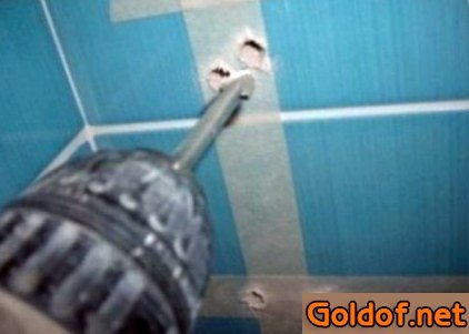 - В случае если на ремонтируемом участке были отверстия для крепления полочки, зеркала или отверстие под выключатель, то их нужно перенести на новую плитку и заранее насверлить. Делают это с помощью особенной насадки на шуруповерт. Вместе с этим сверлят на низких оборотах, чтобы не вышло раскола.