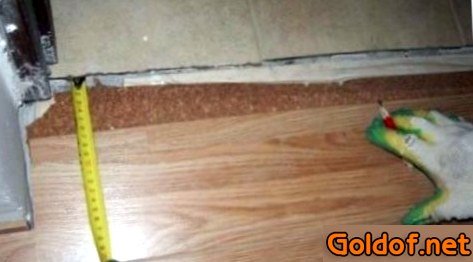 От плитки на 10 см удалив подложку, приступаем к укладке ламината. В местах, где была удалена подложка, ламинат необходимо наклеить к прогрунтованной стяжке, что ему даст дополнительную стойкость. Обычный силикон употребляют в качестве клея, вместе с этим внимательно следя, чтобы избытки его не выходили из шва. Нужное количество силикона определяется зависимо от высоты плитки.
