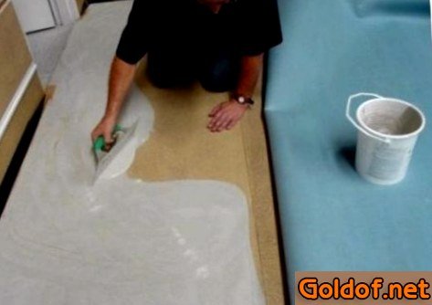 По прошествии 2-3 дней нужно будет обрезать, и наклеить кромки. Перед прирезкой под кромки линолеума, нужно подсунуть полосы ДВП толщина которых три мм, а ширина четыре см. Укладывая линолеум, нужно оставлять небольшой зазор, так как прикасаясь к стенам клеить линолеум запрещено. Для термоизоляции необходимо уложить линолеум на теплоизоляционный слой из минеральной ваты или войлока.