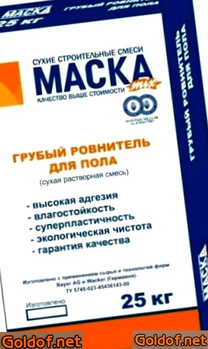- «Твердый выравниватель для пола» от компании «Маска» употребляется для базисного устройства и выравнивания горизонтальной поверхности в помещениях с различным предназначением. В изделие входят такие вещества, как цемент, песок полифракционный и различные хим добавки. В качестве базы для нанесения консистенции сумеют выступать утрамбованные грунты, железобетонные перекрытия, гравийно-песчанные поверхности и другие жёсткие материалы. Основными преимуществами выравнивателя считается его большая стойкость. Поставляется в упаковках по 25 кг, стоимость за мешок от 150 до двести руб.