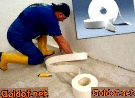 - По периметру обрабатываемого помещения наклеивают демпферную ленту, которая еще именуется краевая или термоусадочная полоса. Она употребляется для компенсации термического расширения стяжки и снятия напряжения с залитого слоя и есть обязательной при заливки поверхности площадью от 30 два м2.