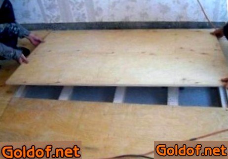 Важный момент. Не надо подгонять края ДСП плит прикасаясь к стене или друг к другу. Необходимо оставлять зазоры от 2-х до 5-ти мм. Такой способ разрешит избежать противного скрипа пола под ногами при ходьбе. На стойкость конструкции такие искусственно сделанные щели никак не воздействую, не считая того поспособствуют дополнительной вентиляции.
