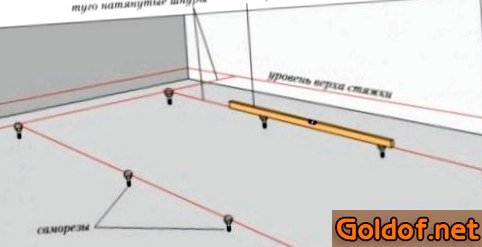 - Перед тем как делать заливку раствора, следует определиться с большой высотой стяжки. Наметив наивысшую точку можно поставить разметки на стенке. Делается это с помощью лазерного нивелира, который отмечает определенную линию (например, на высоте в 55 см). От данной полосы в нескольких местах отмечаются точки вниз на полуметра (на высоту подобающую произведенным расчетам) и прочерчивается по ним ровненькая полоса. Это и будет отметка будущей стяжки. На этом же уровне с ней укладываются маяки и выравниваются в единой плоскости.