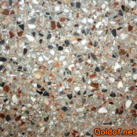 - Верхнего или лицевого слоя, представленного цементно-мозаичной консистенцией, которая складывается из цементного раствора с добавлением мраморной крошки. Будучи не считая этого вариабельным параметром, толщина слоя мозаично-цементной консистенции можно около от пятнадцать до 25 мм и находится в зависимости от размера фракции декоративных мозаичных включений.