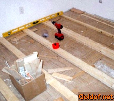 Разработка установки маяков для деревянного пола конструктивно отличается от других. В качестве маяков здесь выступают деревянные лаги – бруски из дерева, какие устанавливают по нулевому уровню. Сначала работ в поверхность вкручивают шурупы так, чтобы их полосы создавали квадрат со сторонами 30 см. Все полосы регулируют в горизонтальной плоскости, а после чего укладывают лаги.