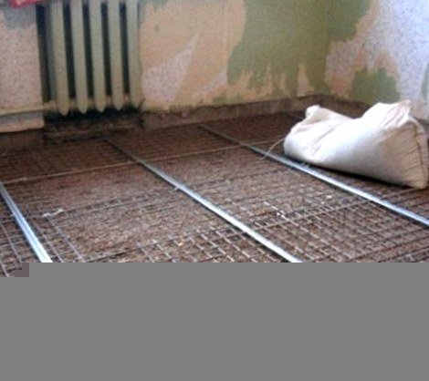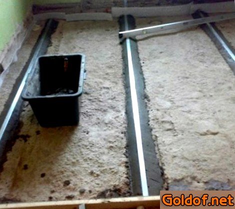 - Уровнем проверяется корректность горизонтальной плоскости профилей и места между ними. Убеждаются, что все полосы выставлены правильно, и начинают закладывать раствор. Маленькое его количество подкладывают под профили в тех местах, где они опираются на шурупы. Снова держат под контролем корректность всех горизонталей. В случае если характеристики верны, то веществом закладывают маяки с 2-ух сторон. Оставляют до полного подсыхания, а после чего делают стяжку пола. Шурупы временами подменяют брусками из дерева, кирпичами или горками из раствора. На качестве стяжки замена никак не скажется.