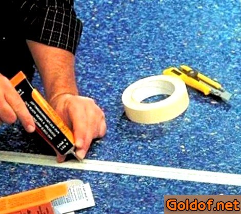 1. В месте установки шва следует приклеить полосу на основе обоестороннего скотча, так получится избежать растекания холодной сварки на полу или на линолеуму.