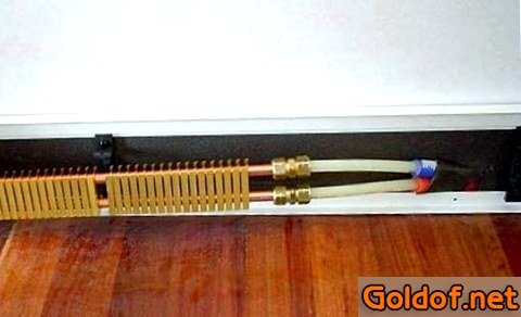 Панели корпуса делаются из экструдированного дюралевого профиля, который снабжает равномерную отдачу теплоты на всей протяженности обогревателя. По методике нагрева модуля плинтусная система не уникальность водяной и электронной. Теплоноситель (электричество или вода) к теплому плинтусу подается от распределительного коллектора с помощью подводных труб. Распределительный коллектор почти всегда оснащается расходомерами, отсечными и сливными кранами, автоматическими воздухоотводчиками.