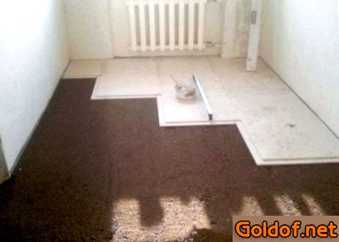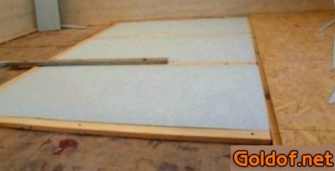 - Порциями засыпается керамзит. его разравнивают и просто утрамбовывают. Потом в обязательном порядке проверить соответствие высоты по уровню. Эта операция делается неторопливо на раздельно взятых участках. Когда будет подготовлен один кусочек пола, он сразу застилается плитой ГВЛ. Ее настилают в два слоя, проклеивая между собой и дополнительно скрепляя шурупами.