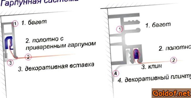 - Гарпунный(французский). По периметру полотна имеется приметное утолщение из гибкого пластика в виде гарпуна. Данный гарпун заправляют в дюралевый профиль средством шпателя. Данный вид считается более надежным.