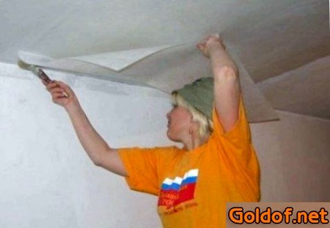 - Избытки полотна по длине срезаются. Важно не делать через чур сильного нажима, из-за того, что на данном шаге стеклохолст есть уязвимым материалом и его довольно. Так, оклеивается вся поверхность потолка. Финишное воздействие – покрыть сверху клеем всю паутинку. Полотна высыхают всецело примерно за денек, по окончании чего гарантировано окажется красивый армирующий слой, крепкий так, что о ремонтных работах на потолке можно запамятовать на много лет.