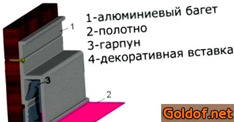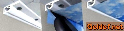 - Средством потолочного багета крепится полотно по его краям к поверхности стационарного потолка, в случае если способности нет крепления к стенам.