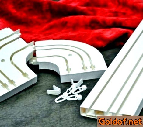 Потолочный карниз из пластика складывается из цельной профильной конструкции. Нижняя его часть имеет место для установки крючков. Кроме этого, в комплектацию к карнизу входят элементы в виде: