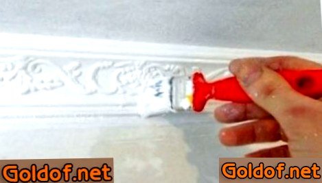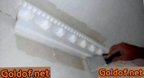 Перед монтажом омочите на потолке и стене места крепления грунтовкой или водой. Так вы можете не допустить быстрое высыхание вещества и уменьшить операцию крепления. Позже разведите шпаклевку и нанесите узеньким слоем средством маленького шпателя на всю оборотную сторону галтели, чтобы в углу при прилегании не оставалось пустот.