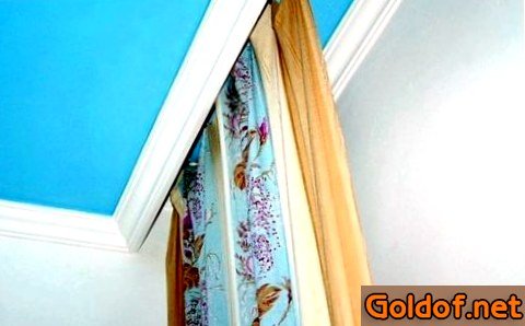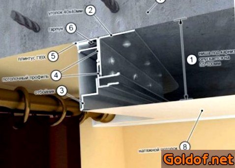 На расстоянии 20 см от стены, в какой находится оконный просвет, к основанию цементной потолочной плиты укрепляют мебельный уголок, к которому позже на всей протяженности монтируют деревянный брус. Определяют середину бруса и в этом месте закрепляют стеновой багет, что необходимо чтобы потолочная пленка обтягивала и, как следствие, скрывала неприглядную конструкцию, складывающуюся из бруса и мебельного уголка. Определяют центр показавшейся ниши и в этом месте закрепляют сокрытый карниз.
