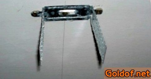 Предстоящие работы будут заключаться в установке подвесов и профилей. Начинаем с подвесов. Они инсталлируются на отмеченные места, строго перпендикулярно полосы для несущего профиля. Закрепляются дюбелями, а концы загибаются в форме буковкы «П», вместе с этим необходимо смотреть, чтобы расстояние между концами соответствовало ширине профиля CD – шестьдесят мм.