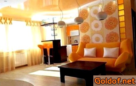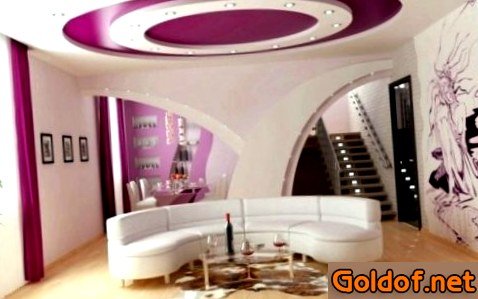 - Гостиная. Цвет потолка очень находится в зависимости от стилистики комнаты. Гостиной hi-tech подходят «прохладные» тона, помещению в стиле прованс и кантри – желтый, ласково-лиловый или оливковый, традиционному интерьеру – белоснежный, бежевый или великодушно сероватый. В случае если габариты гостиной разрешают, то превосходным решением будет установка многоуровнего потолка с композицией контрастных цветов.