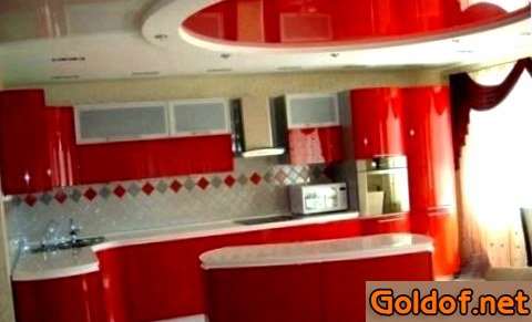 - Кухня должна быть комфортабельной и располагать к общению. Очень кстати будет применение глянцевой потолочной поверхности – такая фактура зрительно расширяет место комнаты.
