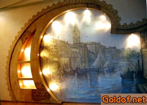 - Набросок на декоративной штукатурке. В данном случае перед тем как приступить к работе делается отделка стенок с целью придания подходящего объема. Картина на стенке, обработанной схожим образом, смотрится как реальная — «жива» и «дышащая»;