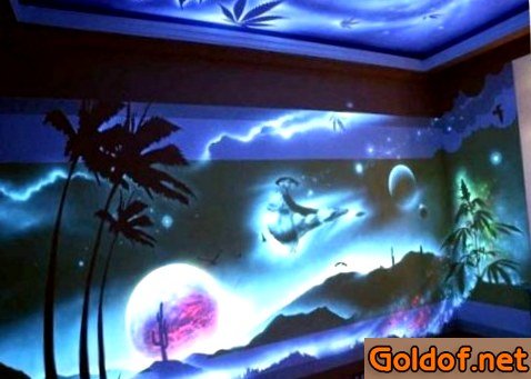 - Видимые и невидимые краски сияют в мгле и приковывают общее внимание. Техника допускает применение красящих веществ с добавлением перламутра и светонакопительных частиц, зияющих в ультрафиолете — зрелище взаправду привораживающее;