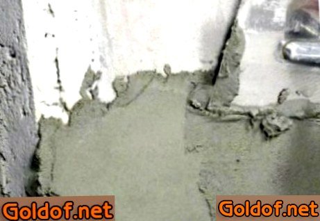 - 2-ой наносимый слой – это грунт, который считается главным слоем. Замес для него делается пара гуще, чем для обрызга. Смесь набирается на штукатурный сокол и с помощью кельмы переносится на поверхность стены.