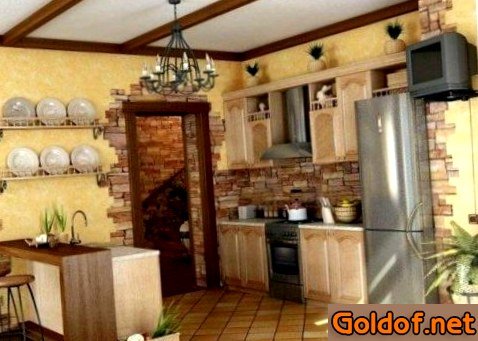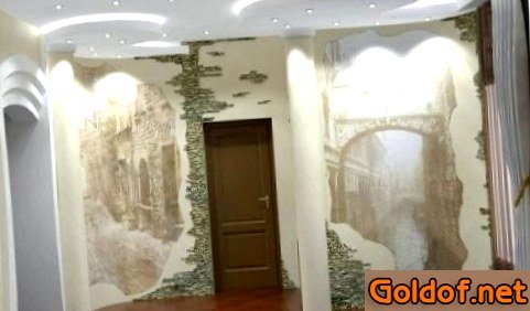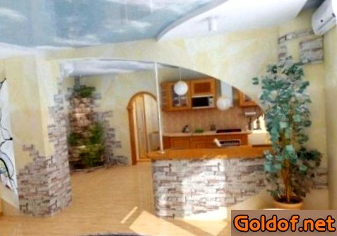 - Специалисты рекомендуют делать ставку на комбинирование «каменного дизайна» с натяжными потолками, легкой штукатуркой или плотными обоями, которое ограничивается только фантазией мастера, осуществляющего работу;