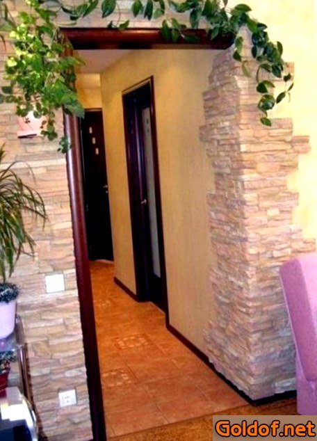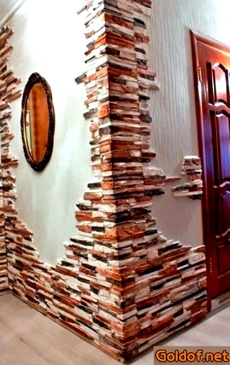 - Что касается отделки углов и конструктивных частей, то более безпроигрышно декоративный камень смотрится при отделке активных частей композиции. Вследствие этого специалисты рекомендуют использовать его для облицовки выступающего угла Г-образной прихожей или несущей колонны, что разрешит прибыльно выделить выступающие композиционные элементы и придать помещению агрессивную ясность.