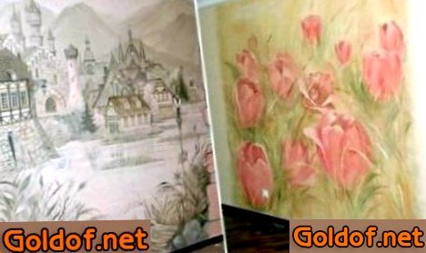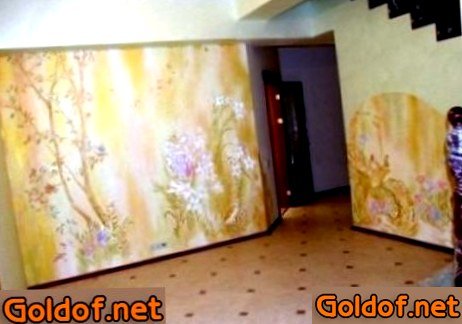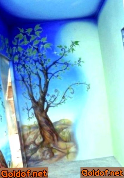 - Создание росписи прямо на стенке поверх финального слоя штукатурки. Это более эргономичный способ рисования акриловыми красками на стенках. Основное как надо приготовить основание, так как в дальнейшем роспись от стены будет уже неотделима.