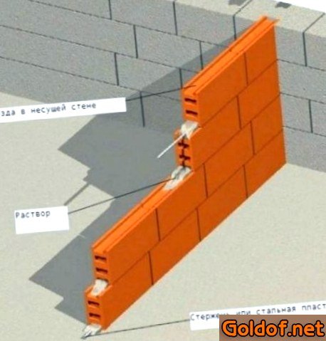 - Сначала перегородка должна различаться конструкционной надежностью. При строительстве несущих стенок в рассчетных местах создают арматурные ленты или половину кирпича (через ряд). В случае если необходимость в дополнительной стене появилась по окончании строительства, то для соединения перегородки с серьезными стенами используются стальные штыри.