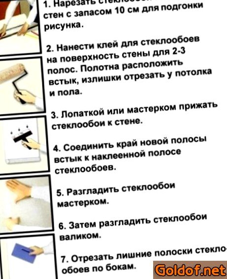 - Клей для стеклообоев наносится на стенку, а не на полотно стеклообоев. С учетом того, что обои наклеиваются встык, необходимо оставлять припуск, равный 5-10 см, для подгонки рисунка. При наклеивании «паутинки» в оставлении припуска нет необходимости;
