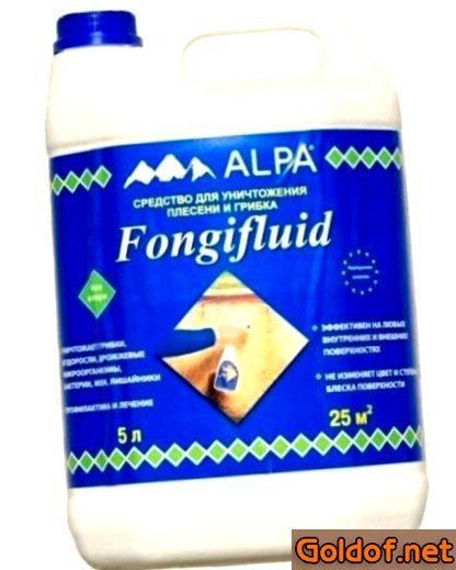 - Также русский состав на основе противогрибковых и противоплесневых компонент. Универсален как для внутренней обработки помещения, так и для наружной, например, стенок дома или неотапливаемого подвала. При применении на окрашенных поверхностях не изменяет их цвета. Данный инициативный фунгицид продается уже готовым к применению и расходуется из расчета 1л/5м2. Стоимость бутылки два л – 600 руб.
