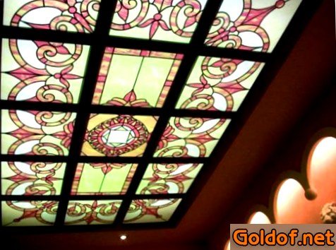 Витражный стеклянный потолок – драгоценное элитное решение. Нанесение разноцветного рисунка на стекло можно выполнить различными способами: от только дорогостоящих, до экономных. Например, литье витража из стекла различных цветов и цветов, которое называют «мурманское литье», вариант не для каждого. Стоимость таких витражей колоссальна, исходя из этого позволить для себя их сумеют только очень безбедные люди. Но витраж можно сделать и другими способами, применяя за базу обычное прозрачное стекло. Первый вариант – приклеить на поверхность стекла пленку с разноцветным витражным рисунком. Один из самых экономных методов, не требующий серьезных издержек и времени. 2-ой вариант – нарисовать композицию от руки особенными красками для стекла. Заранее контуры рисунка необходимо нанести на бумагу или картон, а после чего перенести на стекло. Данный способ оптимален для тех, кто все любит делать своими руками и создавать личные шедевры на собственный вкус. Имеется и другие варианты и техники производства витражей, но мы не будет их рассматривать в виду их трудности.